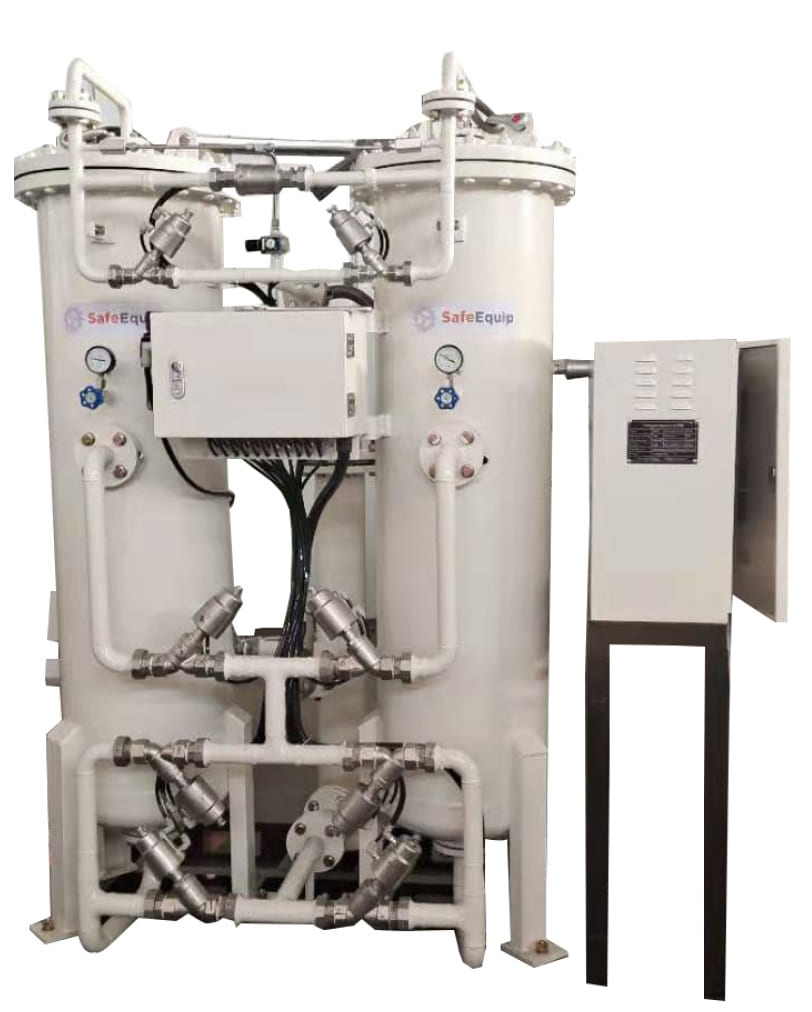 Адсорбционный генератор азота Safe Equip GN-120 работает по технологии PSA: кислород и примеси задерживаются в адсорбционных колоннах, а азот с нужной чистотой направляется в выходной контур.
